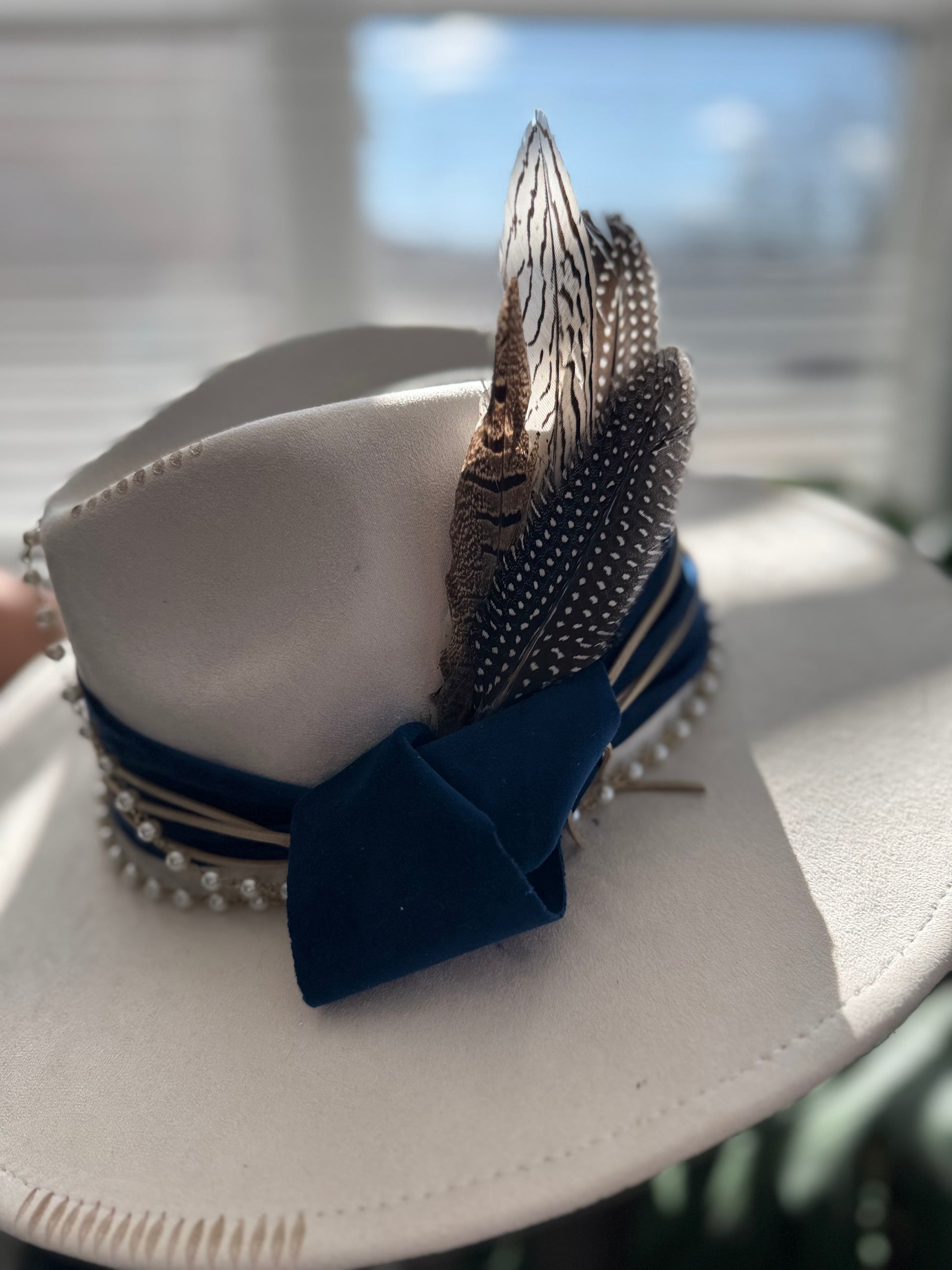 Add a little sparkle to your day. This stunning white fedora with navy accents and pearl trim brings a refined, coastal feel to any outfit. Effortless elegance in every detail!