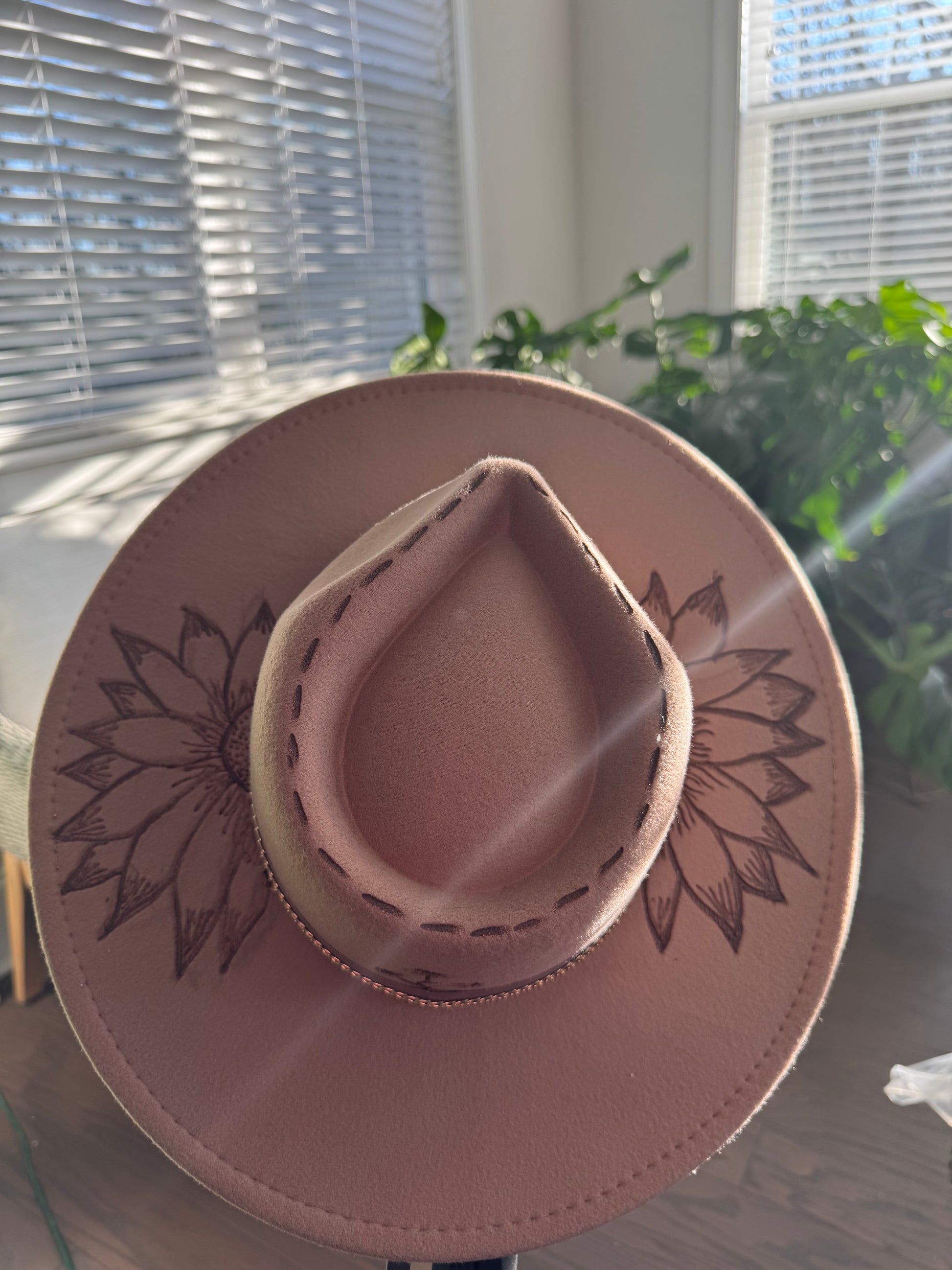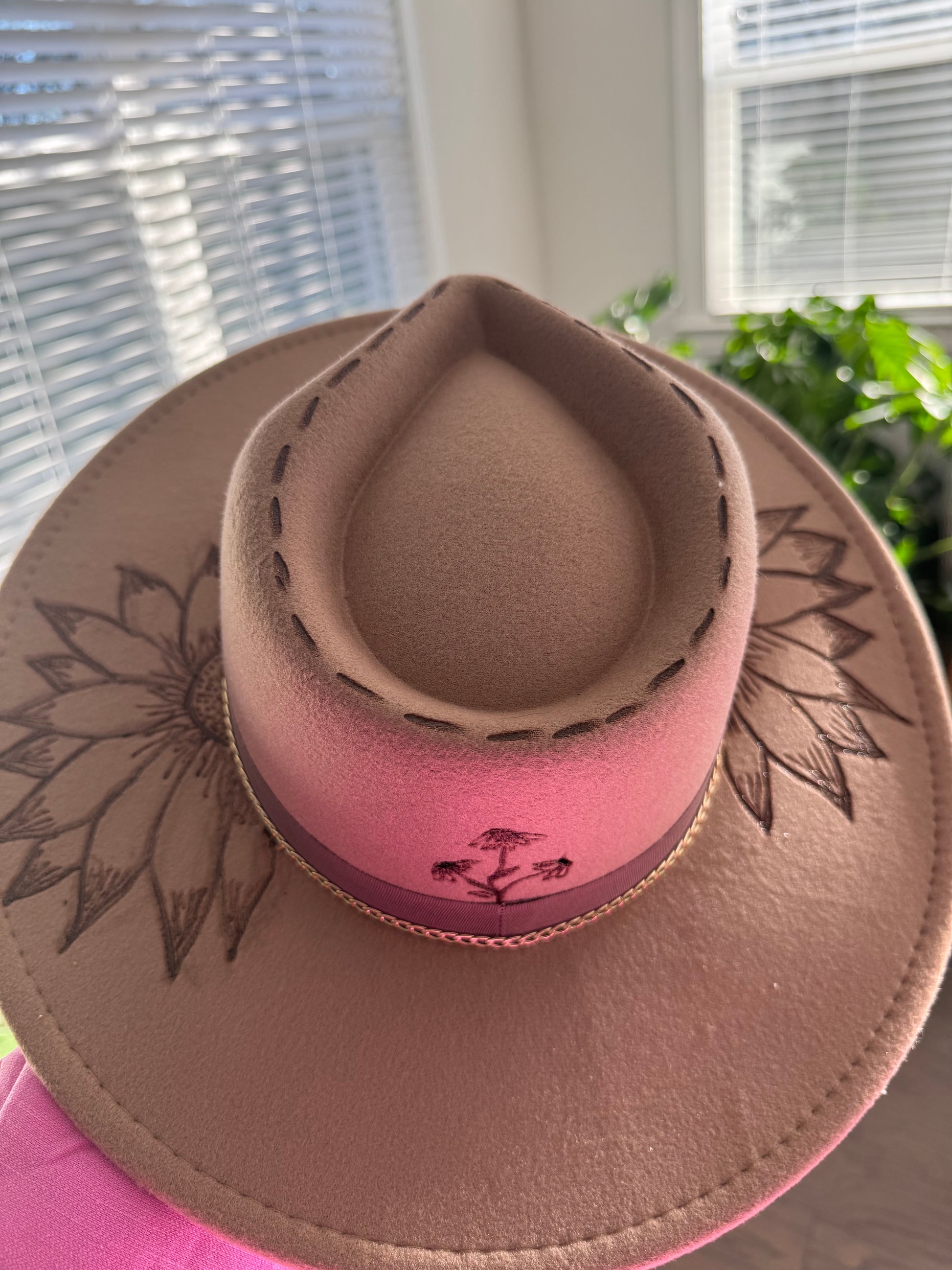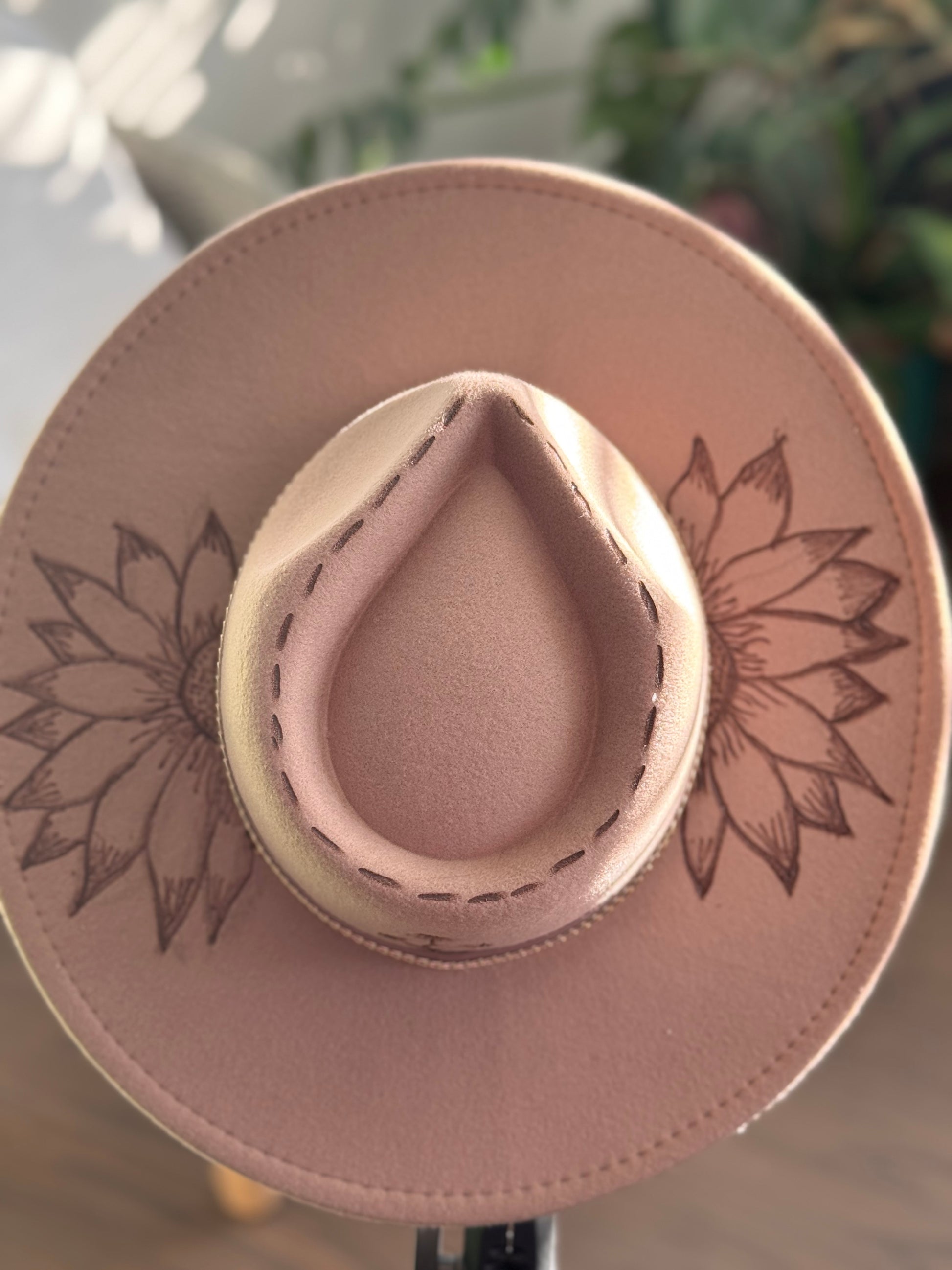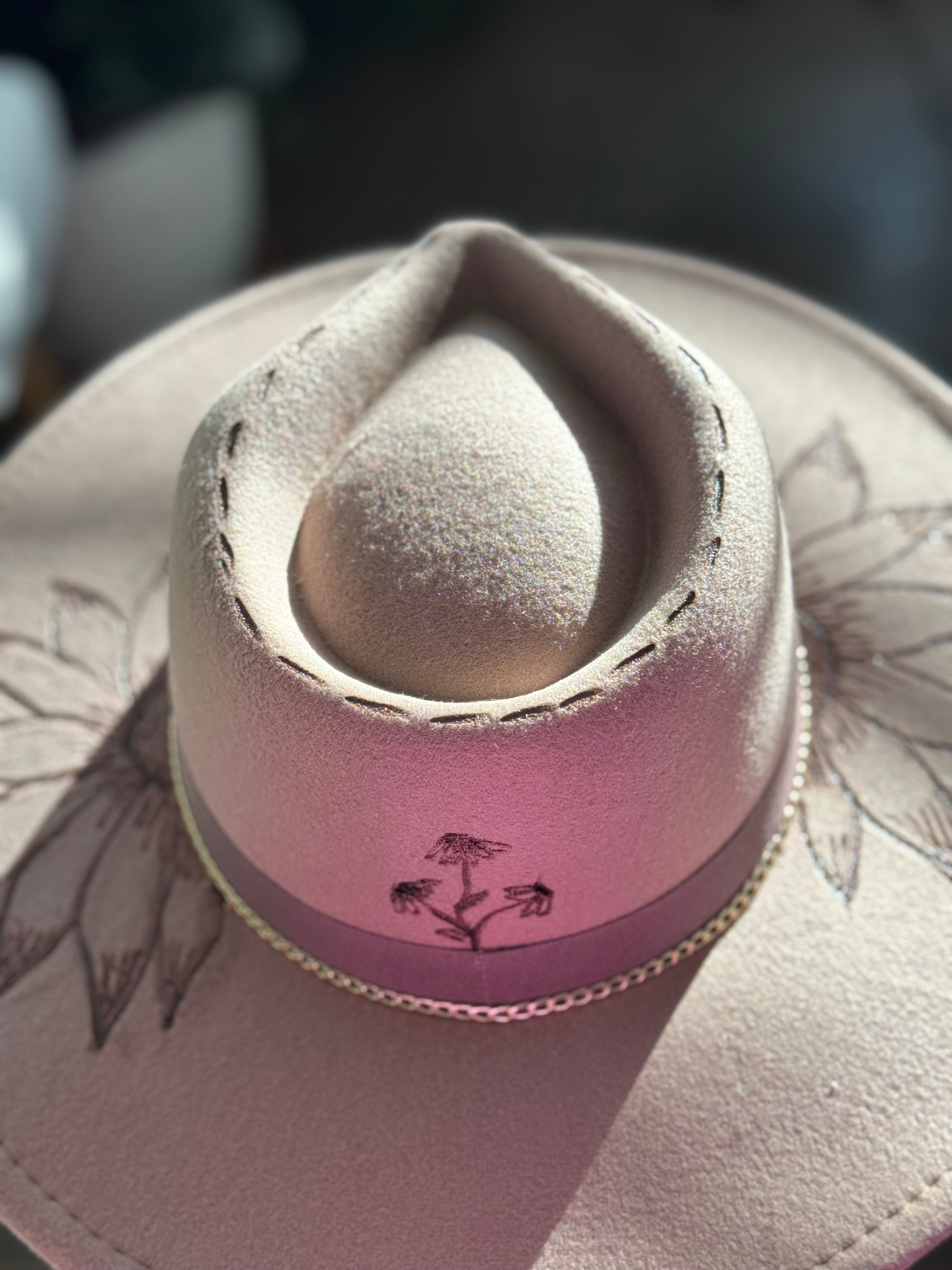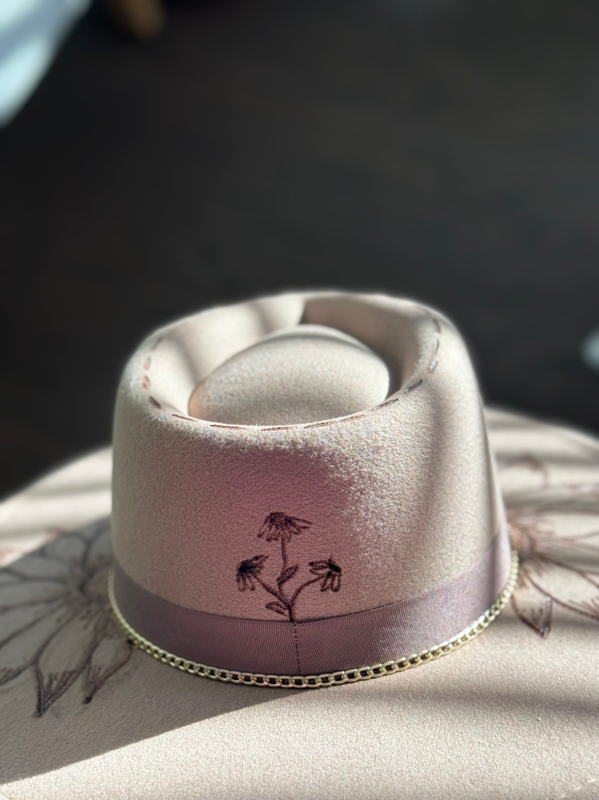 fabric has a gentle burnt, Adorning it are delicate, charred floral accents, their petals still holding a quiet elegance. It’s a hat that carries both a story of warmth and a whisper of wildflowers.