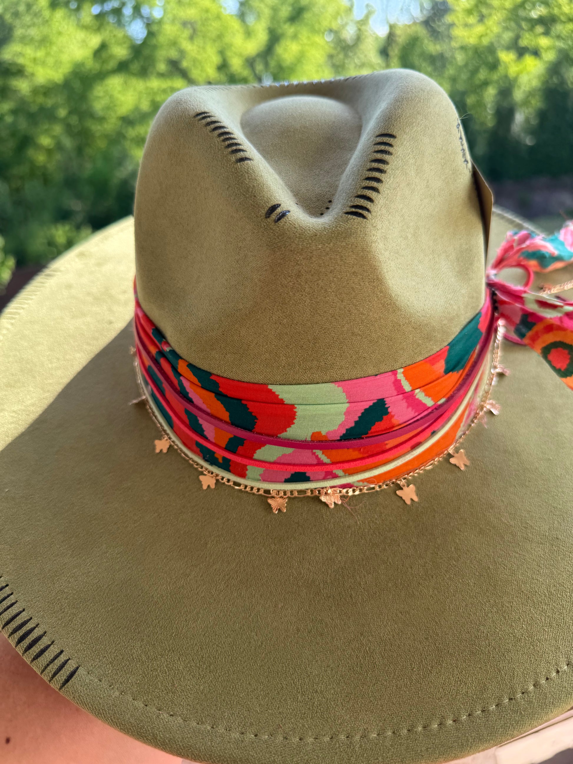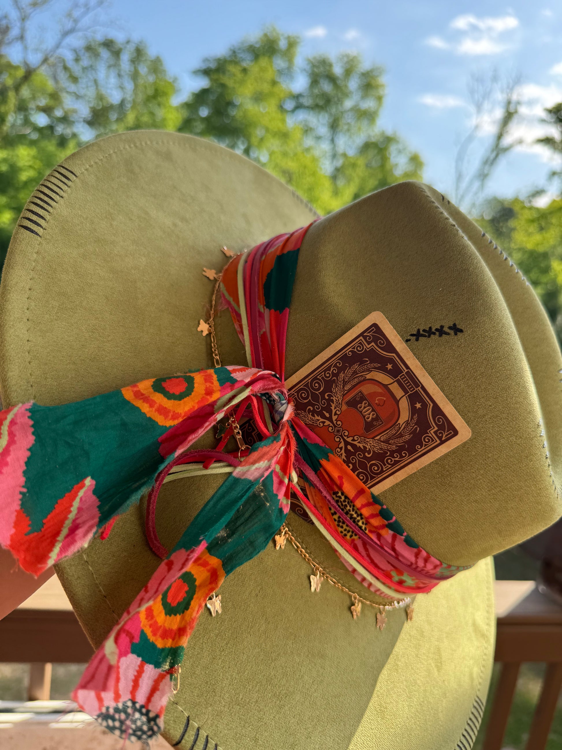 Sage Smoke!!! green suede fedora, earthy, grounded. The brim is wide, casting dramatic shadows, and along the edges, you see hints of burnt detailing.